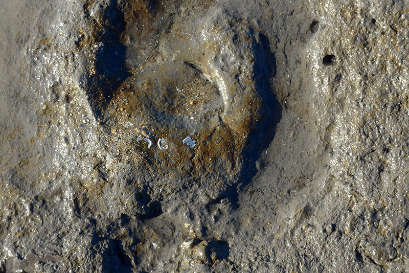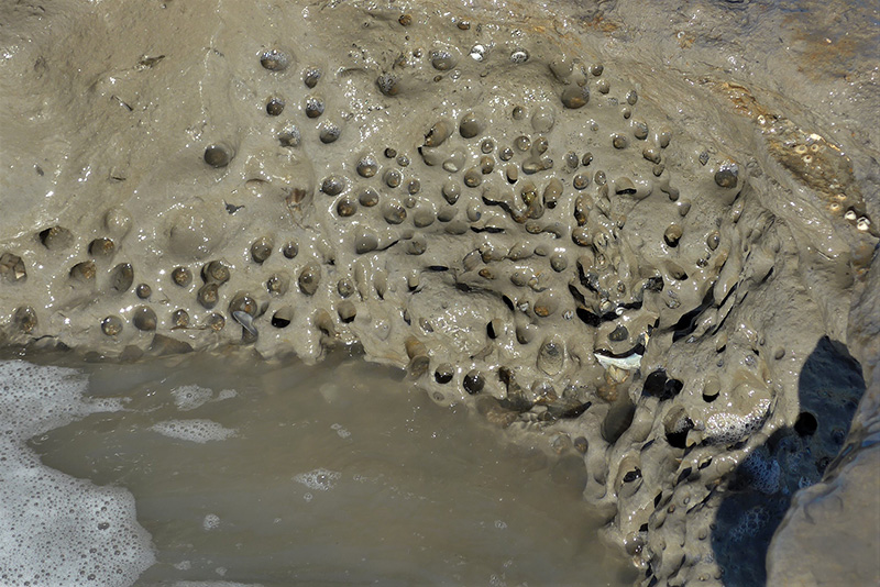 Des pholades, mollusques bivalves perforants (actuels), colonisent les bancs argileux plus tendres, recouverts par la mer à chaque marée. |