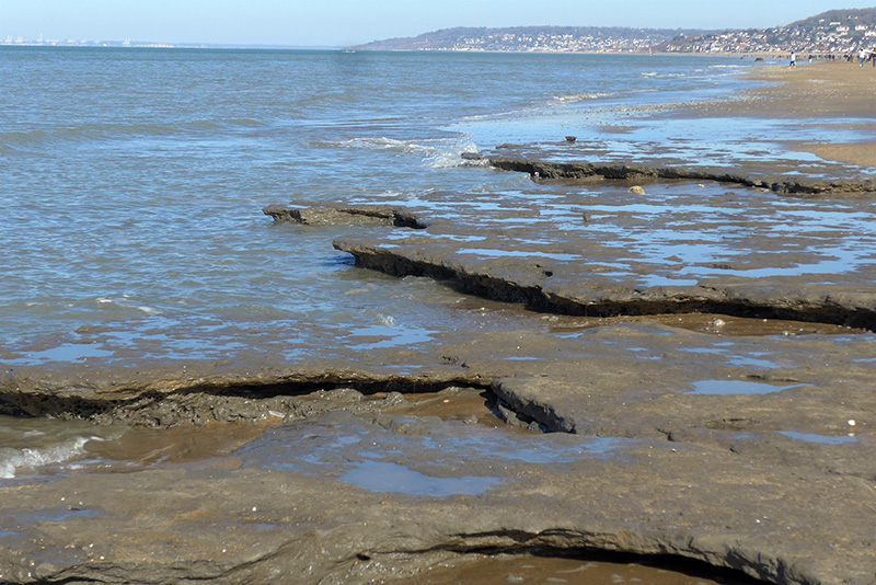 Les Marnes de Dives sont formées par un ensemble de séquences argileuses à passées sableuses et à passées calcaires biomicritiques. Ici, des bancs plus durs, résistant mieux à l’érosion, surplombent des bancs argileux plus tendres.