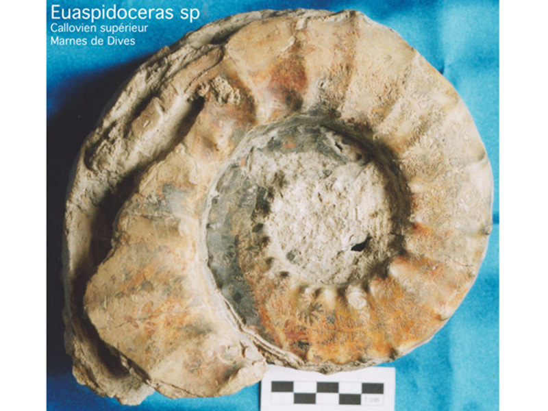 Cette ammonite appartient au genre Euaspidoceras ; elleprésente une coquille planispiralée, dont les flancs, ornementés de côtes grossières espacées, portent une double rangée de tubercules.