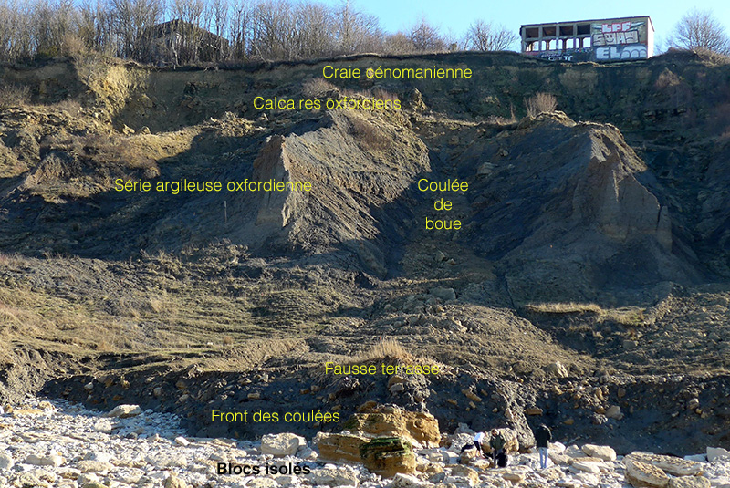 - 1 - Au niveau de la plage, une "fausse terrasse", épais bourrelet argileux, résultant de la coalescence de coulées de boue, dont le front est en permanence sapé par l'action de la mer. - 2 - Au milieu, la falaise argileuse grise (Oxfordien inférieur), d'environ 40 m de hauteur, entaillée de ravins parallèles entre eux, couronnée par une corniche calcaire (Oxfordien moyen). Des coulées de boue progressent dans les ravins.