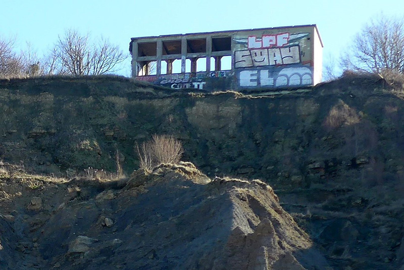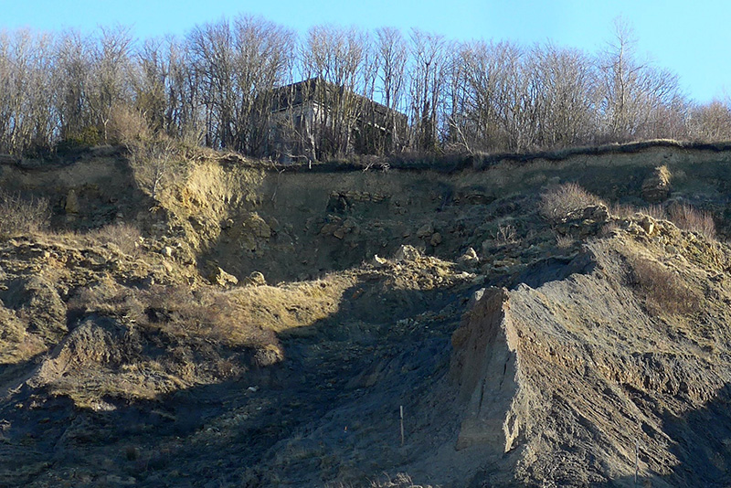 Le front de la niche d’arrachement passe sous le bâtiment qui se trouve actuellement légèrement sous-cavé.