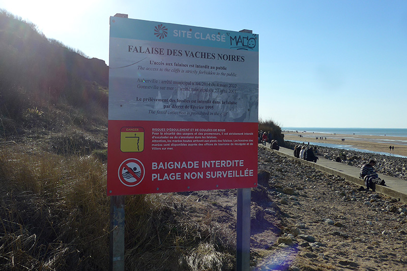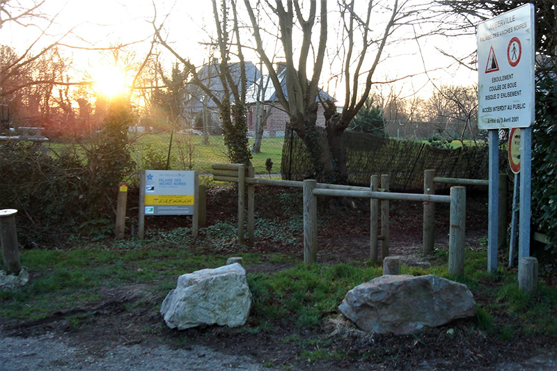 Accès au chaos d’Auberville : un sentier mène à la zone de glissements mais un panneau, daté de 2001, en interdit l’accès.