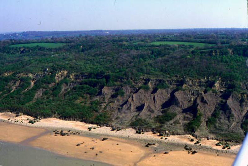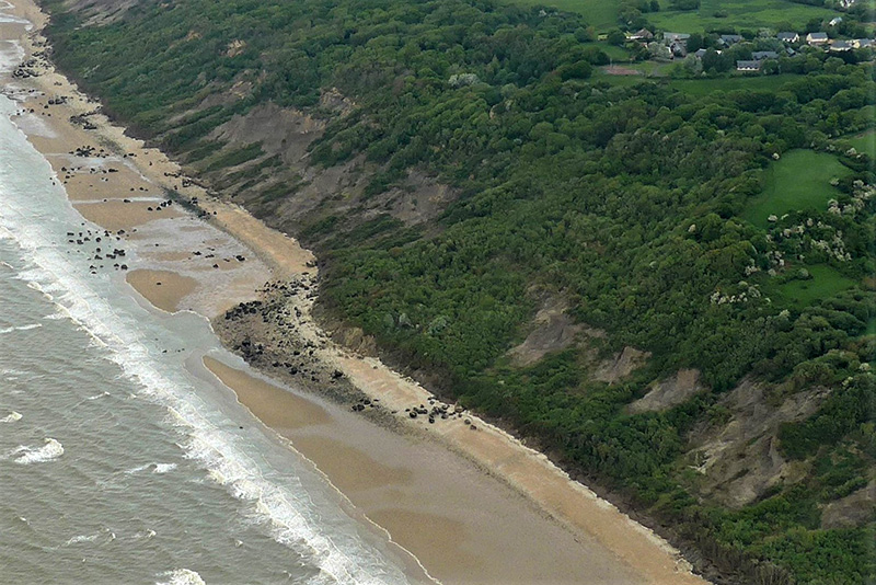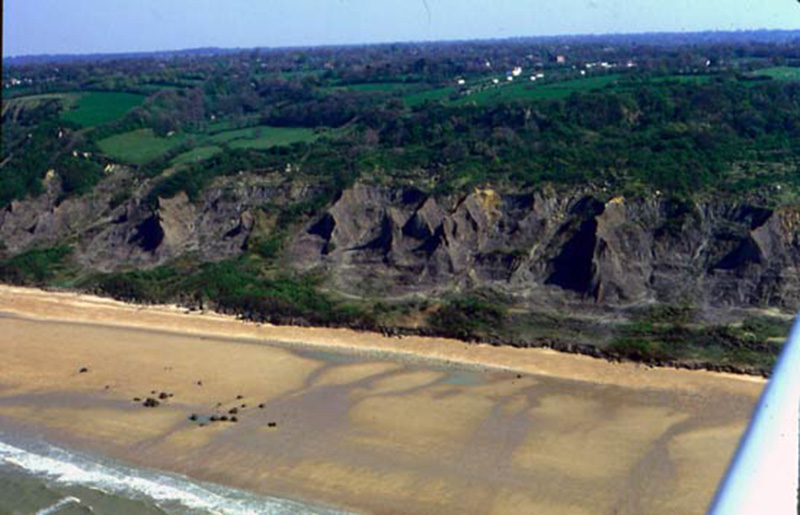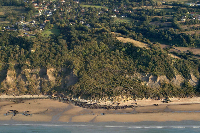 Au sommet des falaises des Vaches Noires, à proximité de Villers-sur-Mer, un bâtiment construit sur la craie cénomanienne, est fortement menacé par les glissements qui provoquent le recul de l’arrière- falaise de craie. Au pied des falaises, d’anciennes coulées boueuses s’avancent sur la plage ; elles apportent des blocs de calcaires du sommet de la série oxfordienne (Oolithe de Trouville et Coral Rag) emballés dans les argiles des formations marneuses. Au premier plan, des blocs calcaires ont été dégagés par l’action des vagues.
