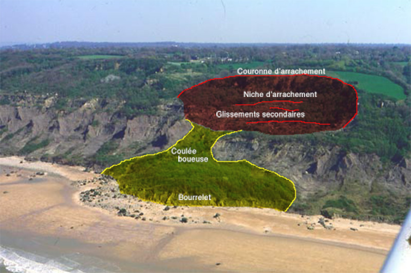 L’érosion a fortement entaillé l’épais bourrelet frontal du glissement. Sur la plage, le cordon de rochers marque le front du glissement. Il est composé de gros blocs de craie cénomanienne issus de la niche d’arrachement et entièrement dégagés des argiles et autres matériaux de la loupe de glissement.