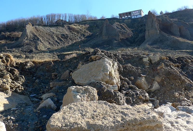Au-delà, en avant des falaises, des traînées de blocs indiquent l’emplacement de coulées issues d’anciens glissements. Elles témoignent du recul progressif des falaises.