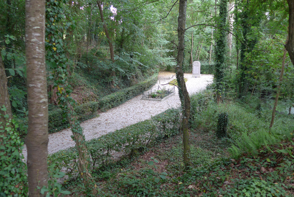 En hiver, le front de taille sud est visible au-delà de la stèle, derrière les arbres dépourvus de feuilles. |