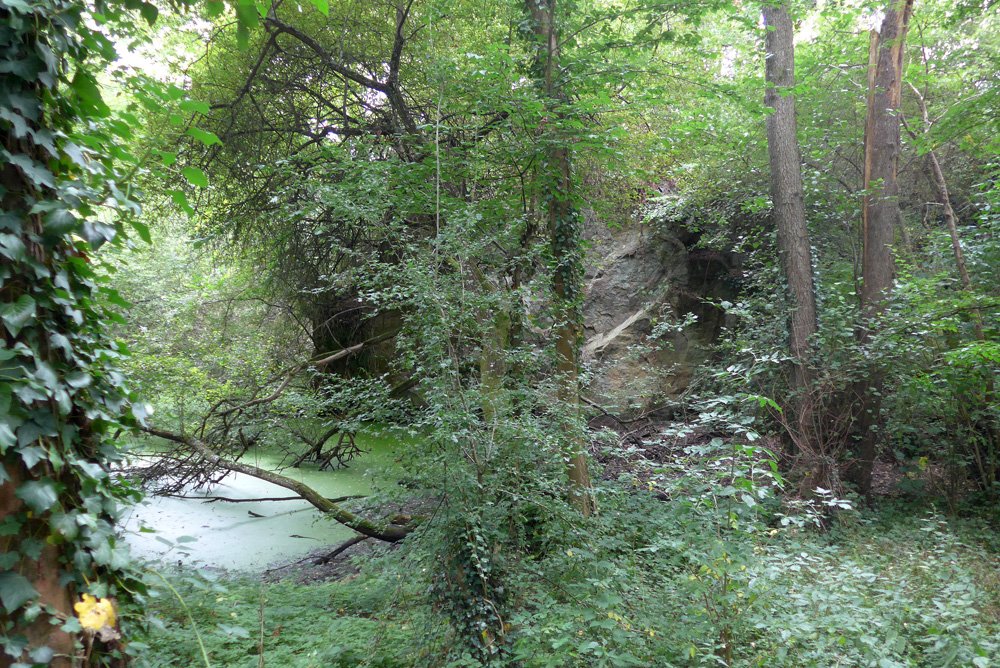 Entre l’espace aménagé et le front de taille ouest, la carrière est inondée ou envahie de végétation et le front de taille est inaccessible. |