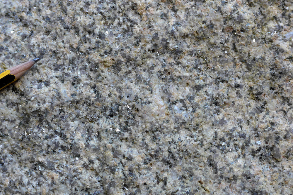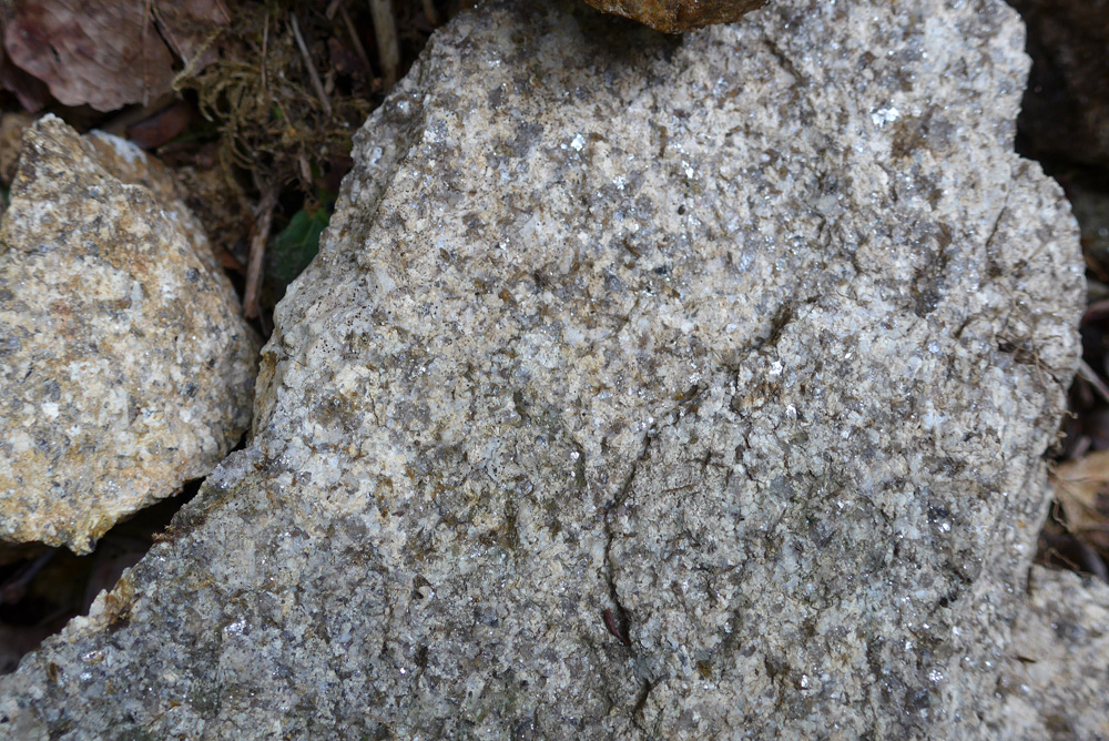 On observe des cristaux de quartz gris vitreux, des cristaux de feldspaths (orthose et plagioclases) blancs, des paillettes noires de biotite (mica noir) et des paillettes blanches de muscovite (mica blanc). |