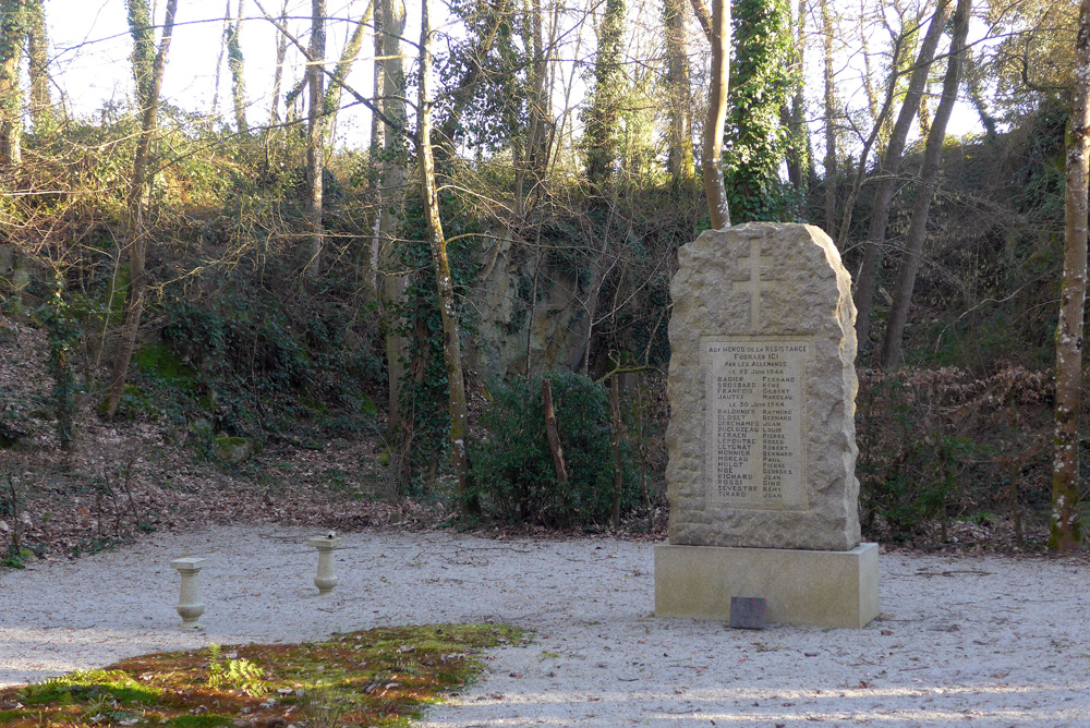 Le site de commémoration est aménagé en contrebas de la route, masquée par les arbres, à gauche. Le front de taille accessible se situe derrière la stèle commémorative. En contrebas du site aménagé, la partie ouest de la carrière est envahie par les arbres et partiellement noyée.