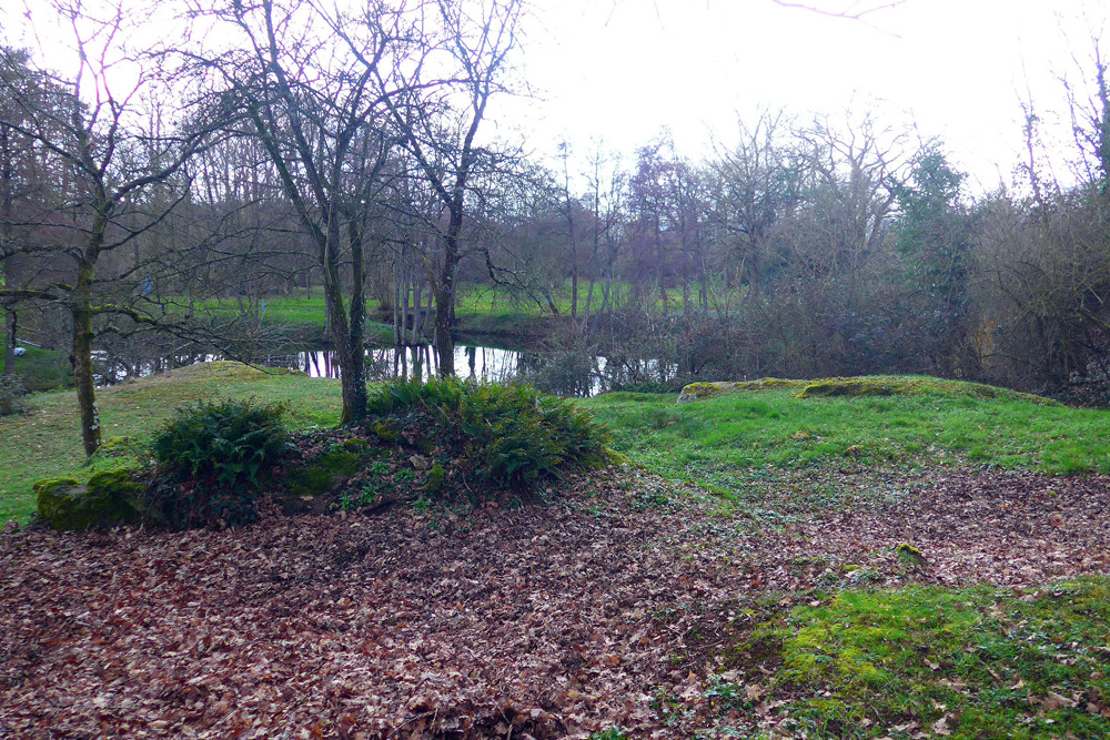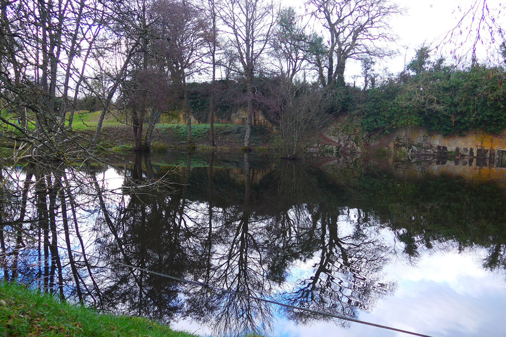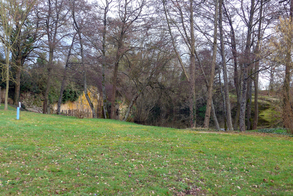 La carrière creusée dans le granite est en partie noyée ; l’autre partie a été remblayée et aménagée en un parc bien entretenu. Vue prise à l’entrée du site, vers le Nord-Ouest |