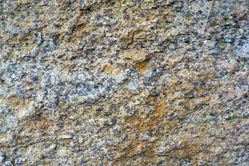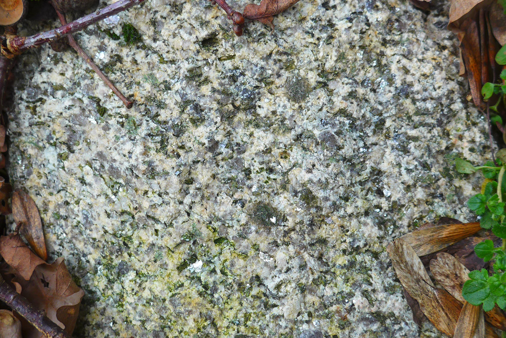 Un des blocs présente des amas noirs qui sont des ségrégations de biotite.