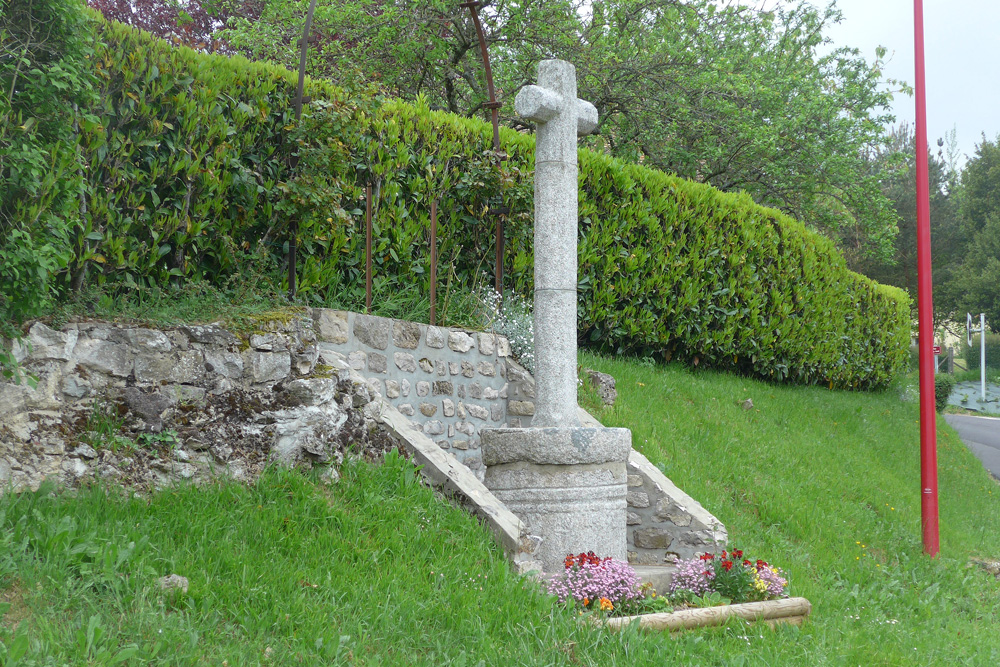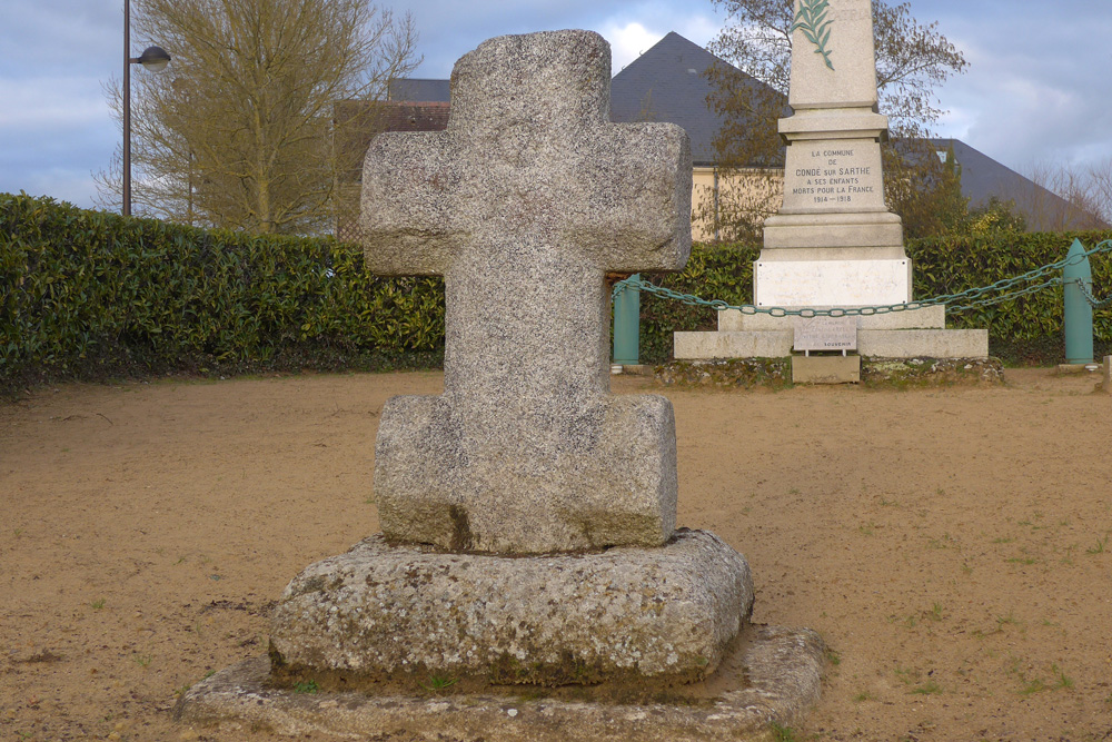 Croix en granite à quatre branches installée devant le monument aux morts de Condé-sur-Sarthe |