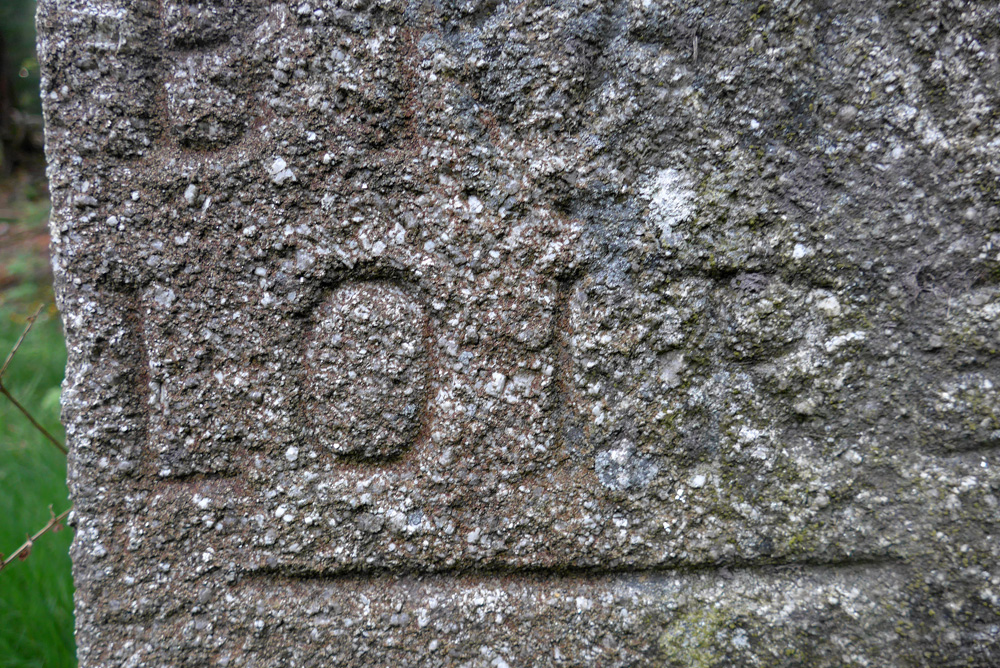 La surface de la borne est couverte de lichens incrustants. On distingue surtout les gros cristaux blancs de feldspaths. Ce granite des bornes a été extrait de la carrière du Hertré à Condé-sur-Sarthe.