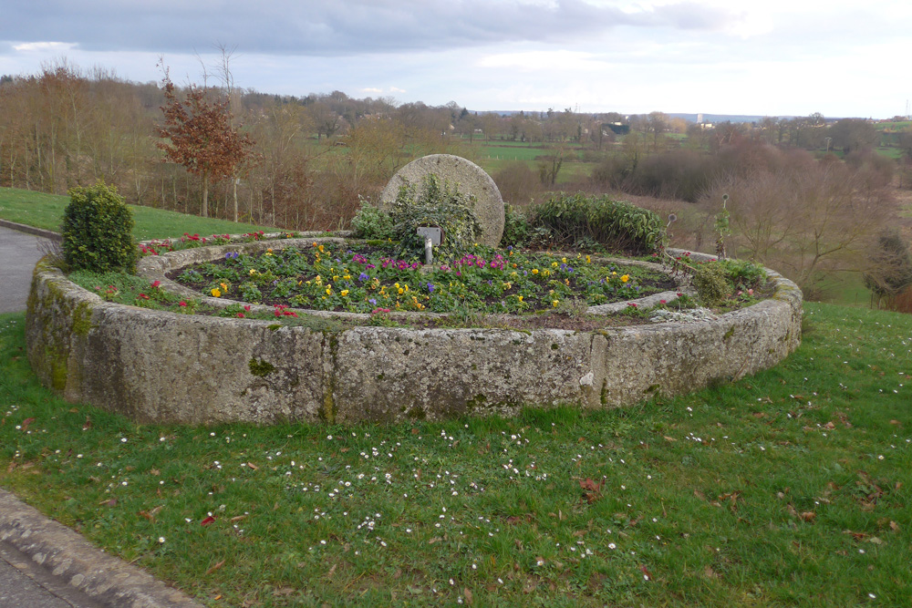 Ancien tour de pressoir en granite installé sur le terre-plein de la mairie qui domine la Sarthe |