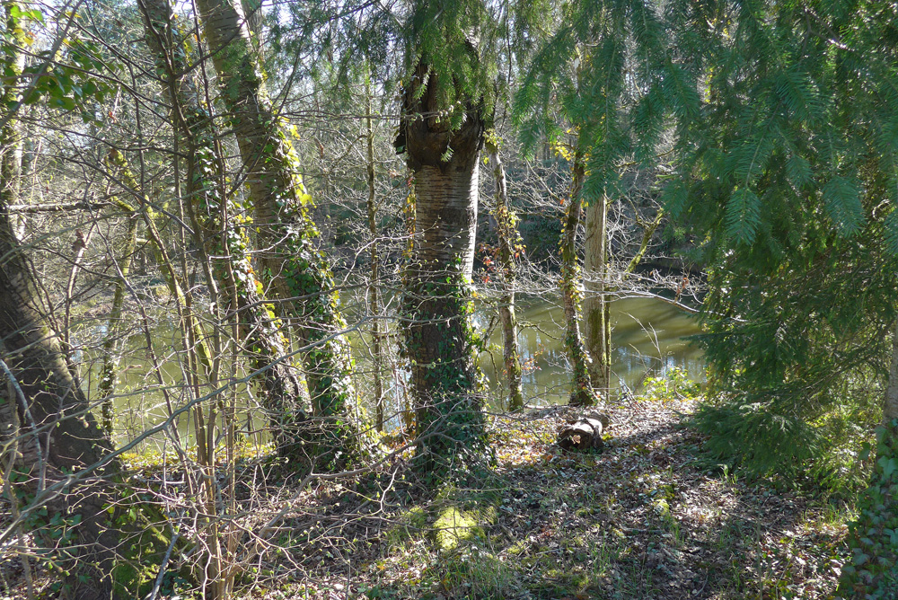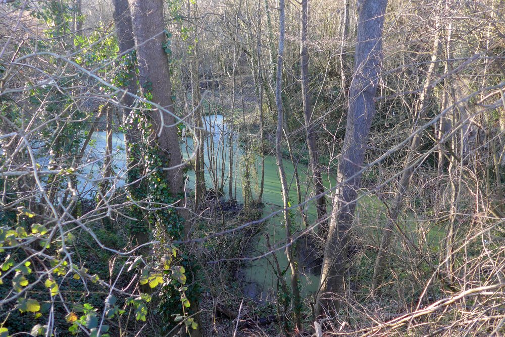 Elle est inondée et incluse dans une propriété privée clôturée ; on peut l’apercevoir à travers les arbres depuis la lisière d’un champ qui borde la rive ouest de la rue du Château d’eau. |