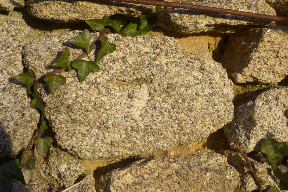 A Pont-Percé, les murs des maisons anciennes de la rue de l’Eglise offrent un échantillonnage de leucogranite tel que celui qui a été extrait de la carrière de Pont-Percé. |