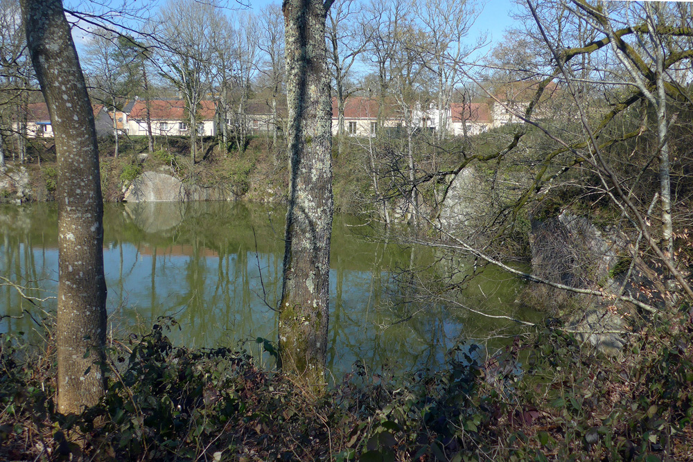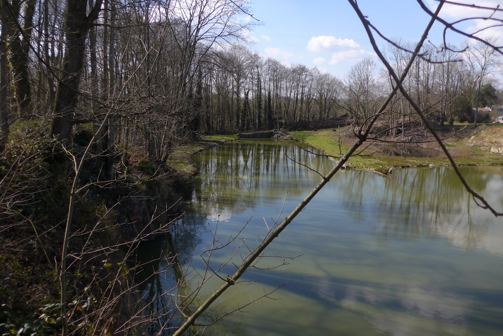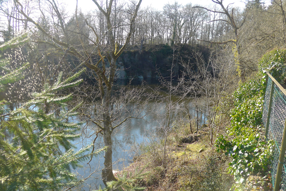 Souligné par un rideau de grands arbres, le bord ouest de la carrière longe la vallée du Cuissai. Vue prise vers le Nord-Ouest |