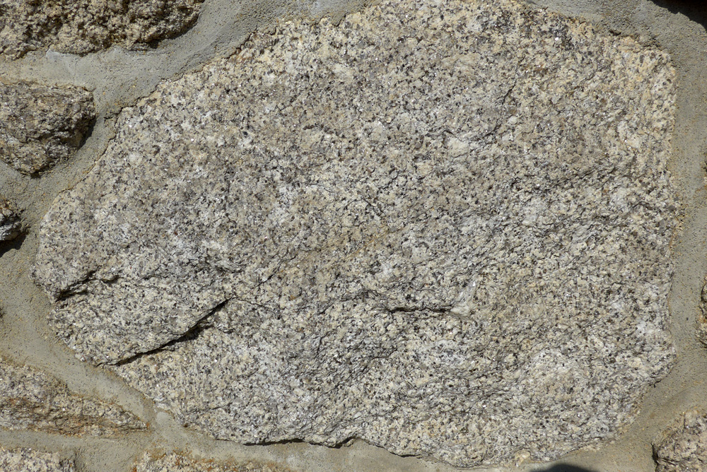 Leucogranite à deux micas, sain et légèrement altéré, dans un mur de maison