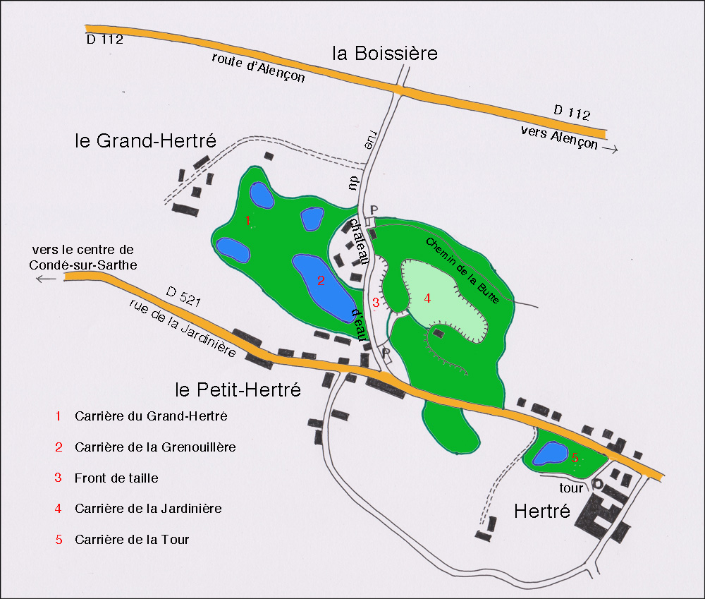 Au Sud de la Boissière, une zone boisée abrite plusieurs anciennes carrières de granite dont celle du Grand Hertré qui a fait l’objet d’une intense exploitation et qui a donné au granite d’Alençon son autre nom : le granite de Hertré. |