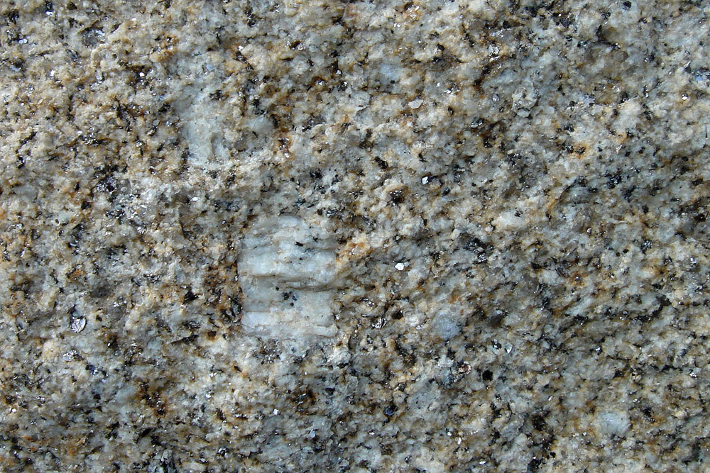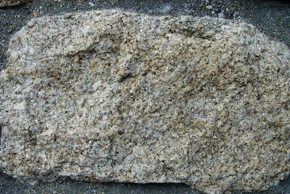 Ce granite, très clair, est riche en petites paillettes brillantes de muscovite (mica blanc). Tous les minéraux sont clairs (quartz vitreux et feldspaths blancs) sauf les biotites (micas noirs).