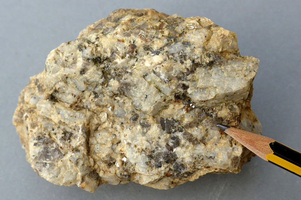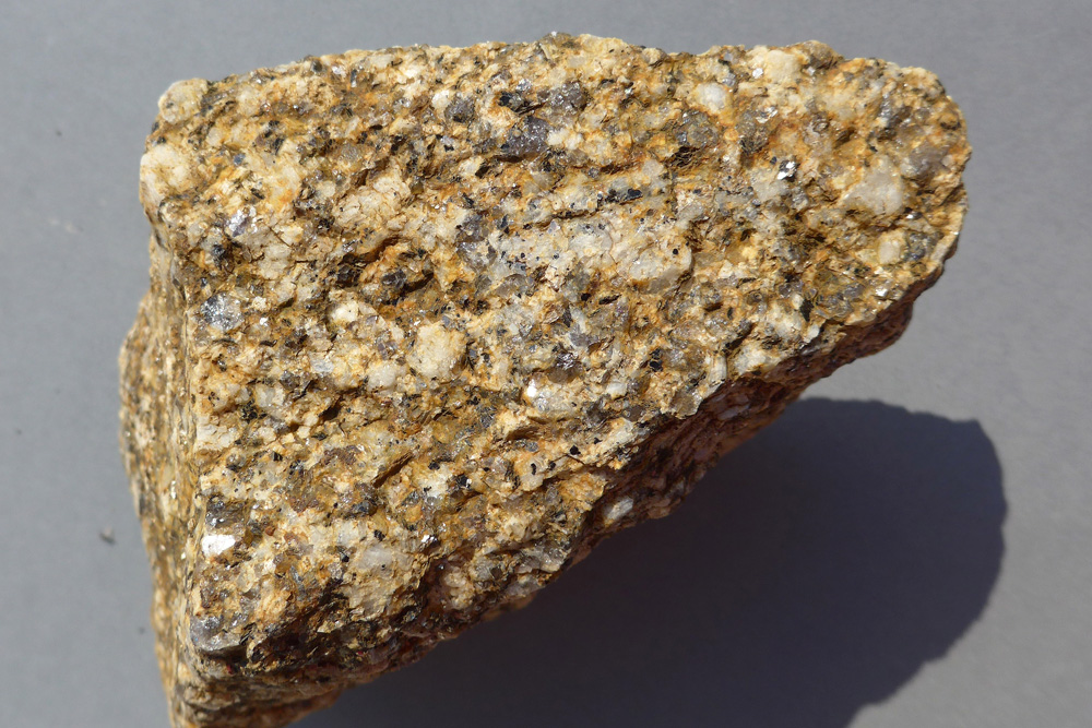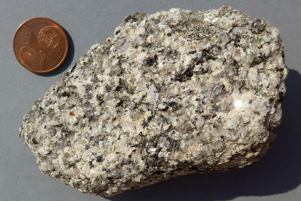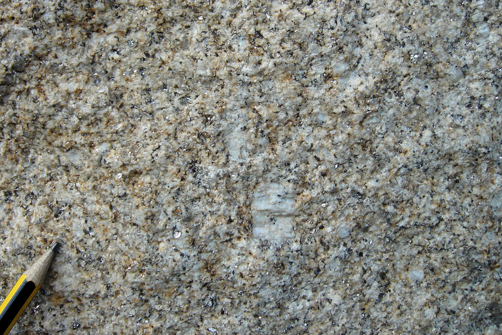 De composition minéralogique constante, le granite d’Alençon présente des faciès variés selon la localisation dans le batholite. Ces faciès diffèrent essentiellement par la taille des cristaux. Ici, l’échantillon photographié présente un faciès à grain fin contenant de gros cristaux blancs de feldspath (1,5 cm de longueur) et de nombreuses petites paillettes de muscovite.