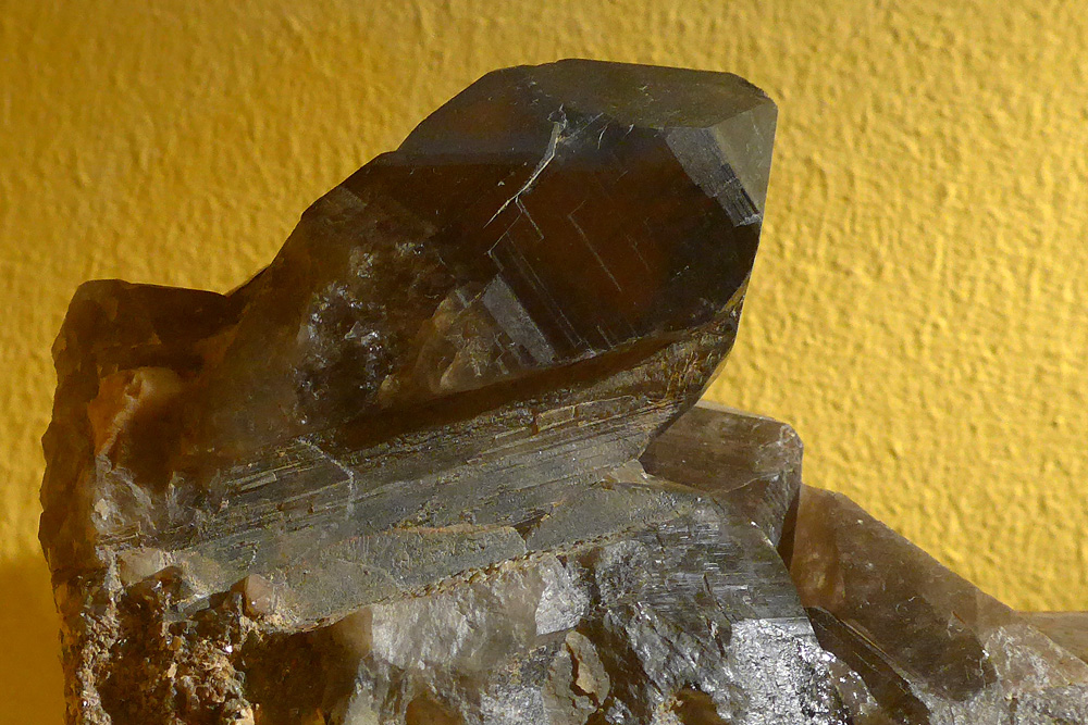 Cristaux de quartz dans un moellon de granite mur de Mauperthuis. Un des cristaux est légèrement fumé, un autre de petite taille se présente sous forme d’une aiguille à tête pyramidale.