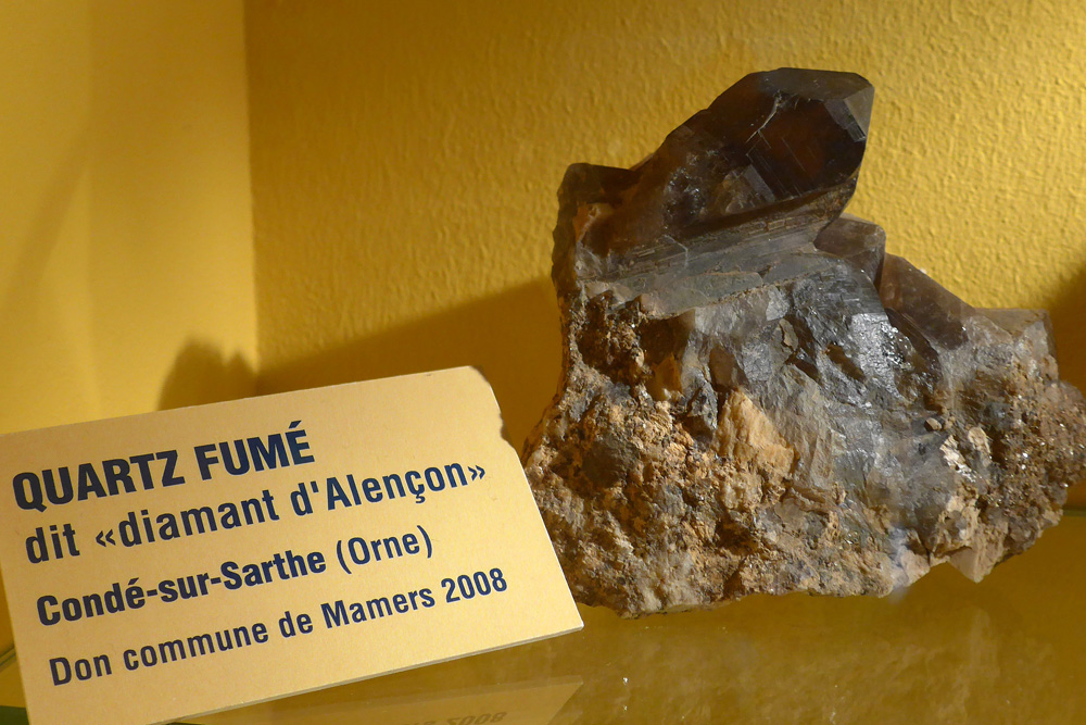 Les veines pegmatitiques du granite d’Alençon contiennent une variété de quartz appelé «diamant d’Alençon». Cette curiosité minéralogique est présentée dans les vitrines du Musée Vert, Museum d’Histoire Naturelle, du Mans. Au 19e siècle, la carrière de Pont-Percé, située sur la commune de Condé-sur-Sarthe, a fourni de nombreux exemplaires qui étaient vendus aux voyageurs sous le nom de diamants d’Alençon. |