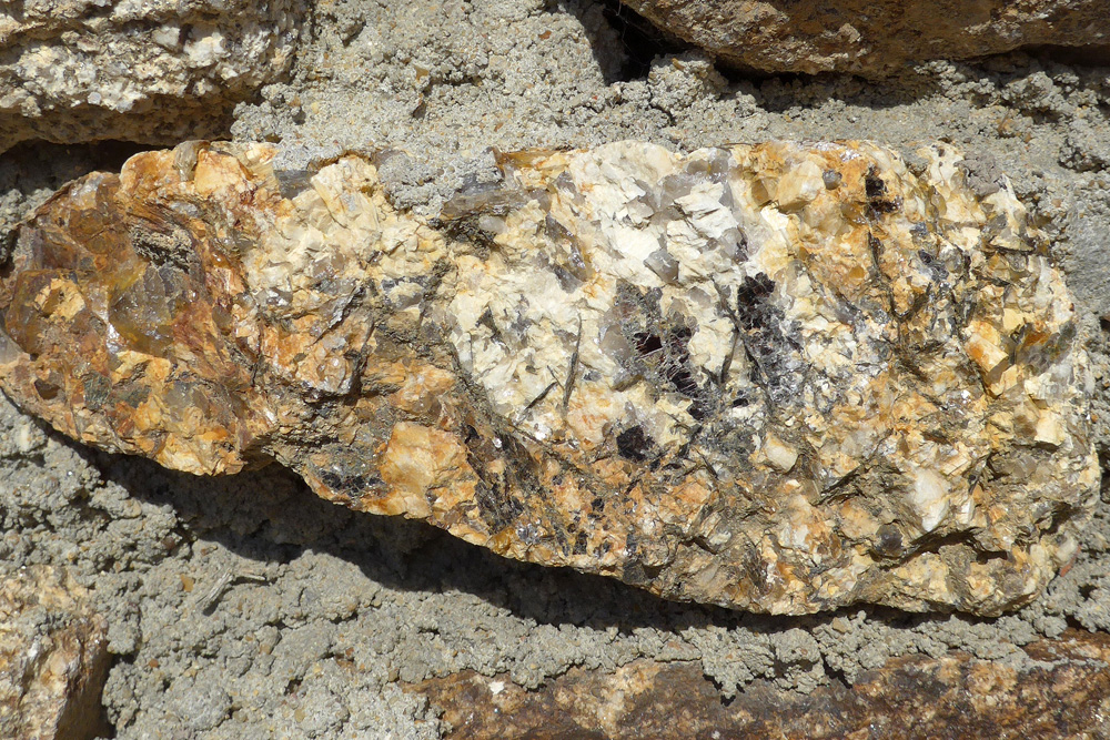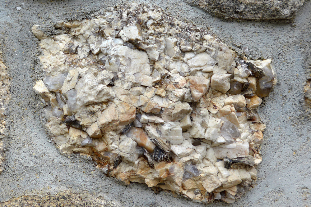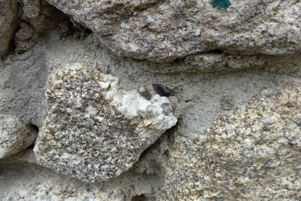 Le leucogranite d’Alençon est parcouru par des veines de pegmatite constituée de très gros cristaux de feldspath (blanc) et de quartz (vitreux). Cet échantillon, enchâssé dans un mur de Pont-Percé, contient des gros cristaux de biotite (noire) dont la tranche présente un aspect feuilleté caractéristique.