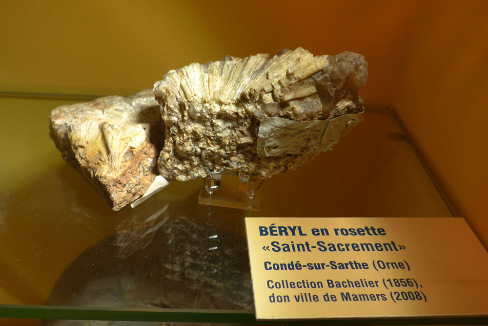 Les veines pegmatitiques du granite d’Alençon ont aussi délivré des cristaux de béryl., présentés aussi dans les vitrines du Musée Vert du Mans.