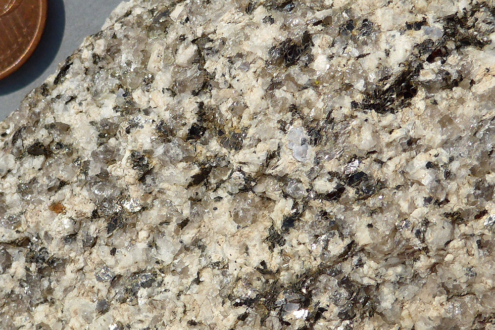 On y observe de grands cristaux noirs de biotite. |