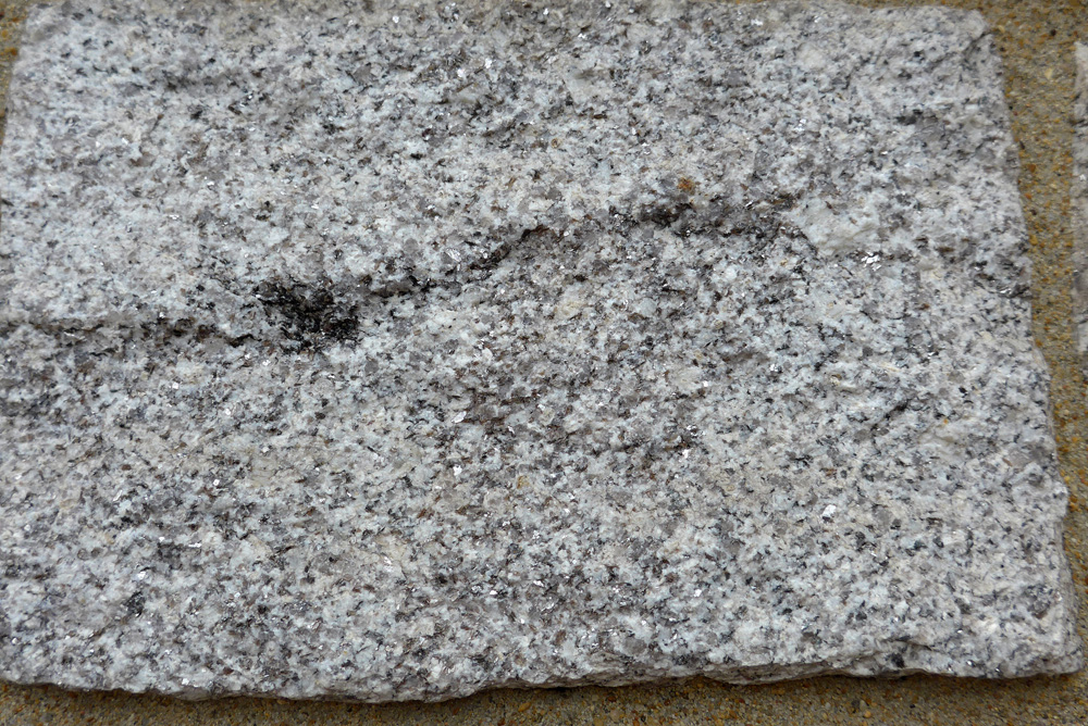 De teinte gris clair et légèrement bleuté en absence d’oxydation, le granite d’Alençon est un leucogranite. Il est constitué de constitué de minéraux majoritairement clairs (quartz, feldspaths, muscovite) et de biotite noire. |