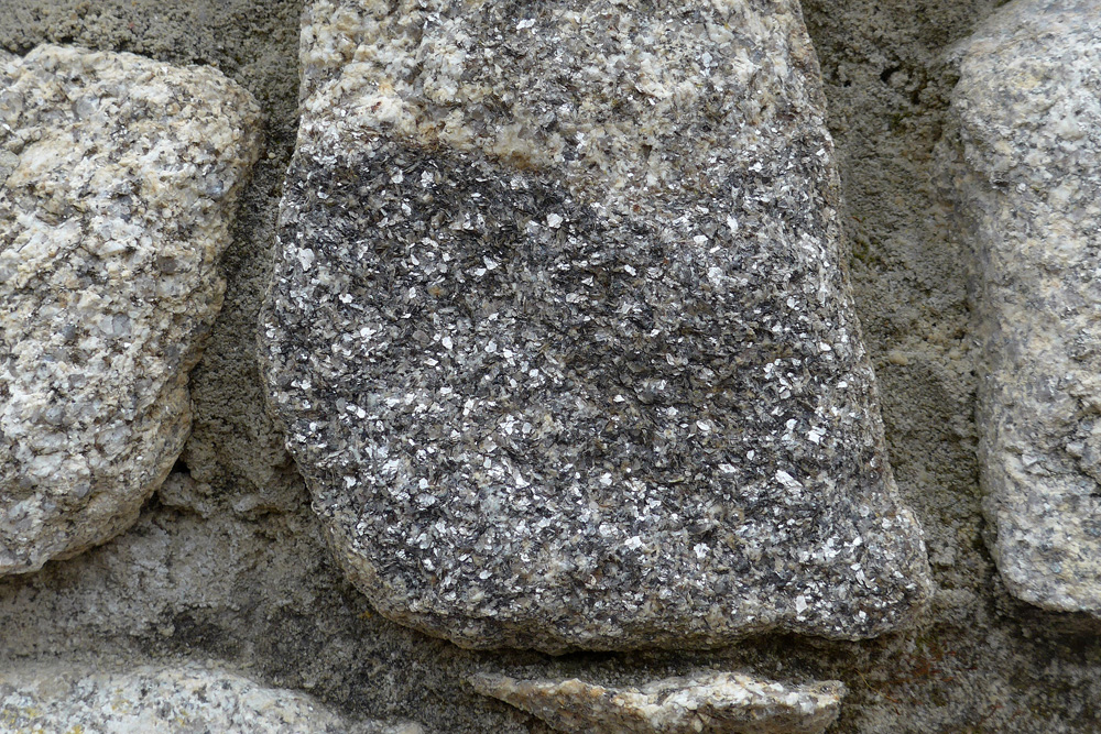 Concentration de biotite (noire) dans un moellon de granite d’Alençon