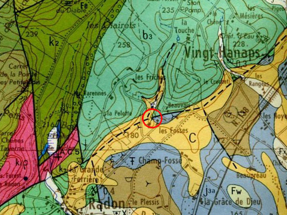 Les pertes sont localisées le long de la grande faille orientée N60 qui borde le Massif d’Ecouves ; cette faille met en contact la série schisto-gréseuse briovérienne du Massif d’Ecouves et les terrains calcaires jurassiques de la Campagne d’Alençon.