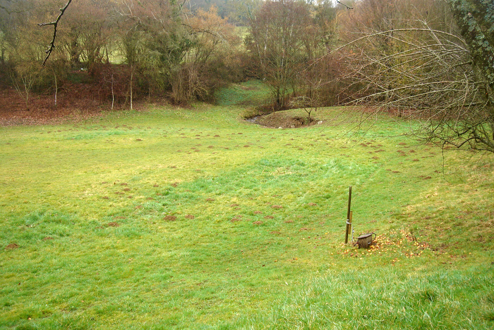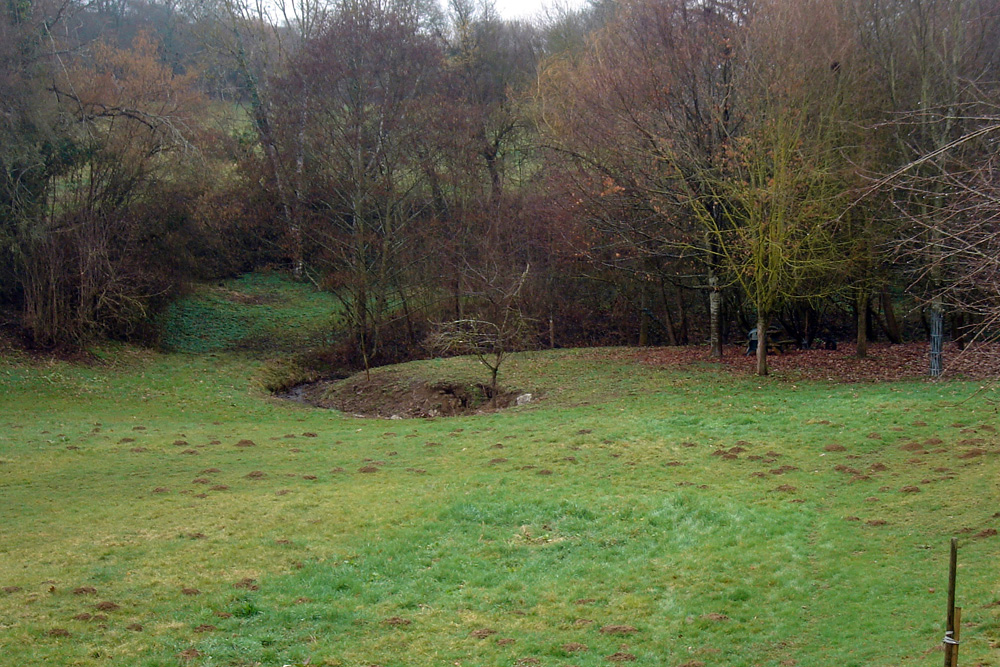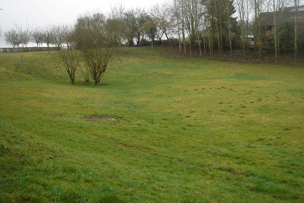 Les bords de la dépression remontent en pente douce vers la route et les habitations voisines. Vue prise vers le Sud