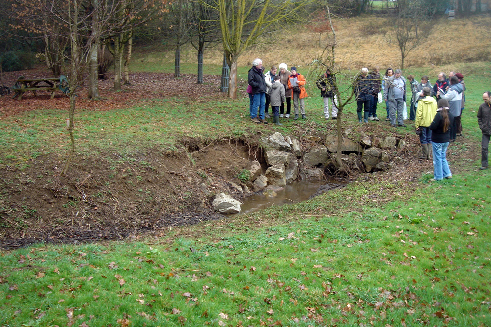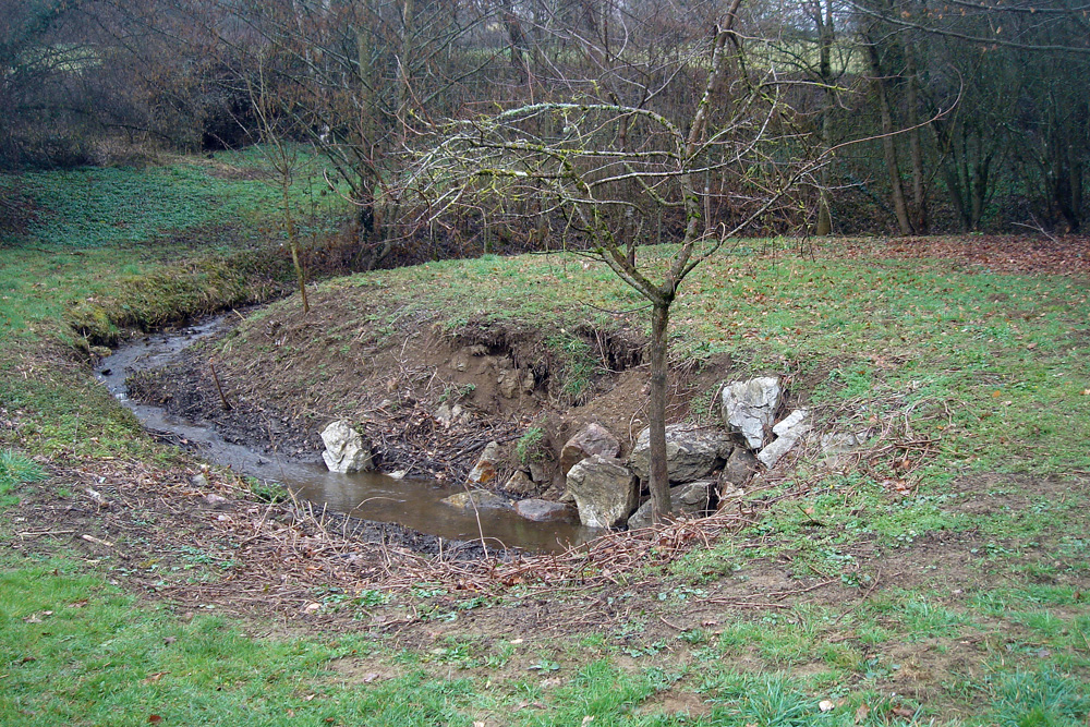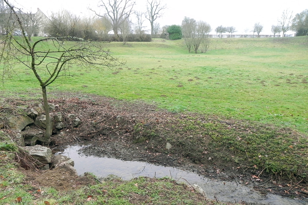 Au lieu-dit les Fosses, le ruisseau issu de l’étang de Beauvais sort d’une zone boisée et se perd dans une prairie.