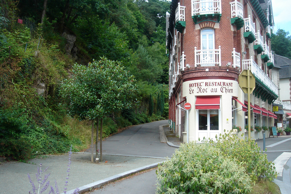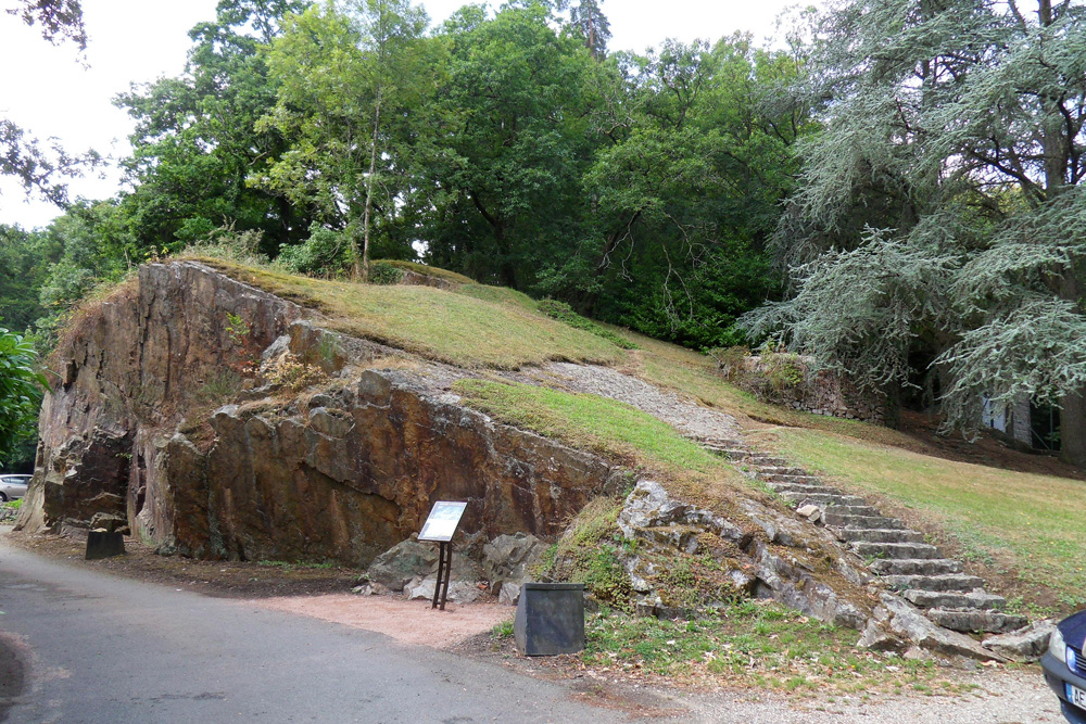 A l’extrémité sud de l’allée Beatrix, le Grès armoricain est envahi par la végétation. L’allée, qui débouche sur le site des Thermes, est relayée par l’allée qui longe le pied du pierrier du Roc au Chien. |