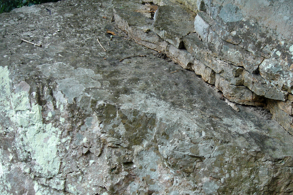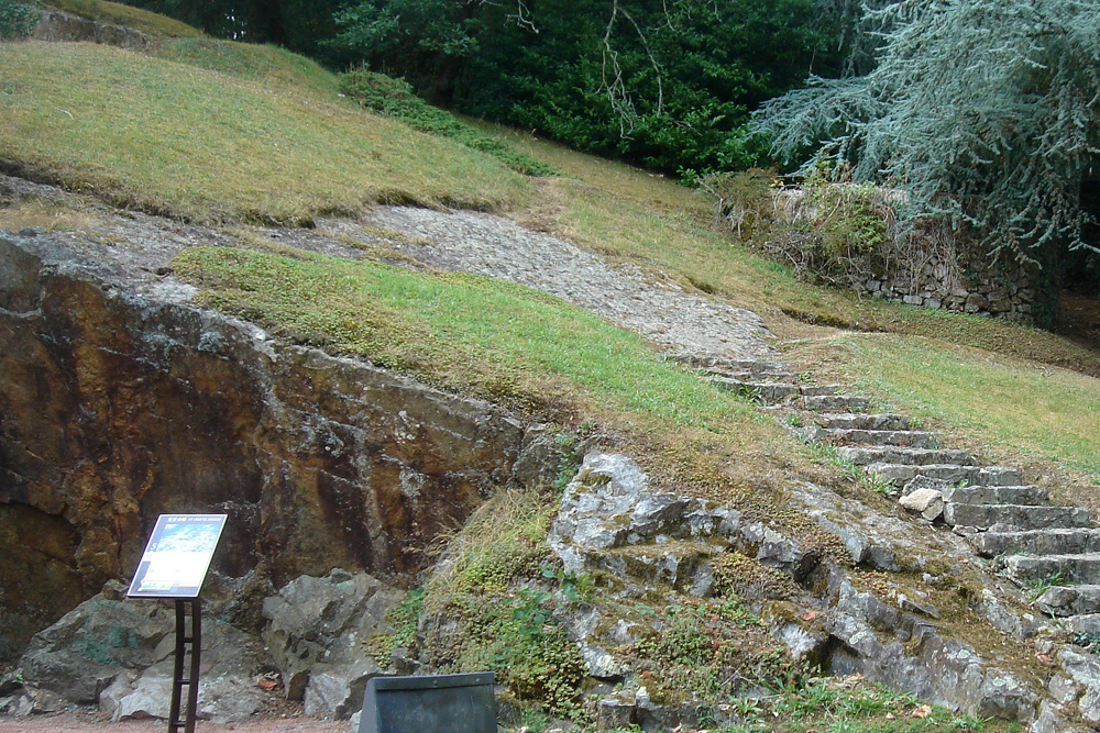 En haut de l’escalier, une partie de la surface de banc est dégagée de toute végétation et affleure dans de bonnes conditions ; elle expose de nombreuses traces de bioturbation. Un panneau explicatif évoque le dépôt du Grès armoricain au Paléozoïque, il y a 475 Ma, et le creusement de la cluse (au Cénozoïque, au cours des derniers millions d’années).