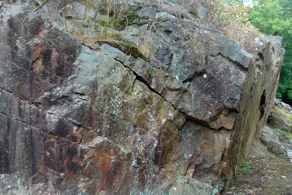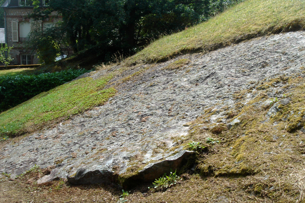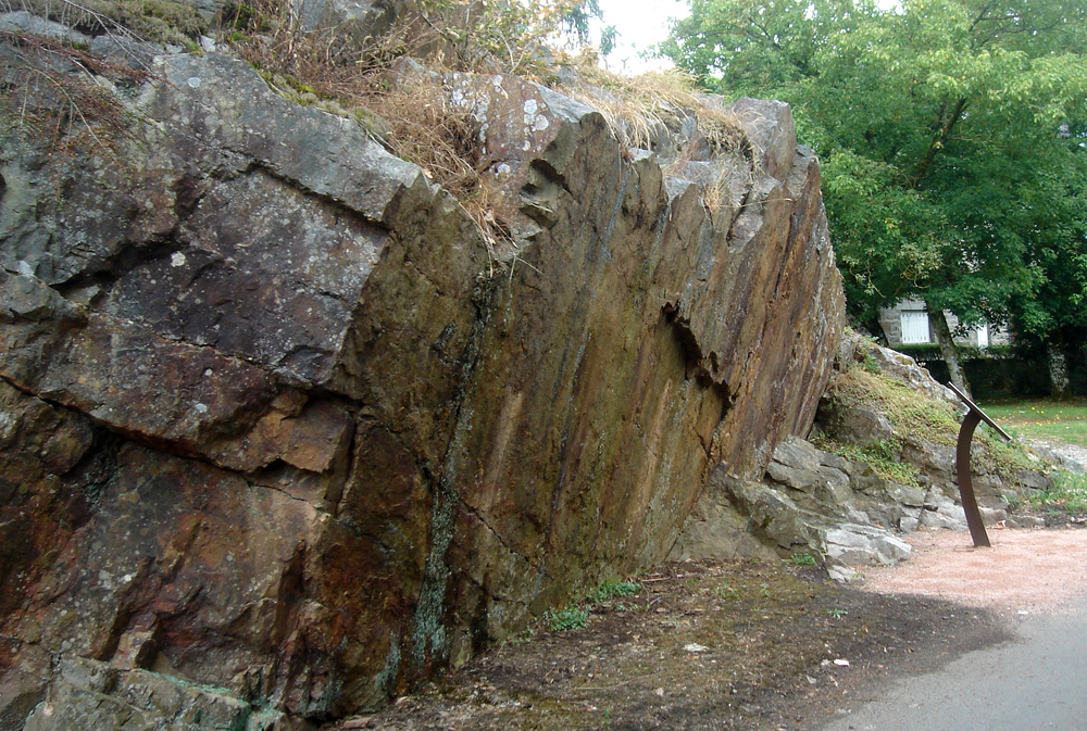 Un plan de fracture subvertical recoupe les bancs de Grès armoricain et limite l’affleurement du côté de l’allée (côté Est). |