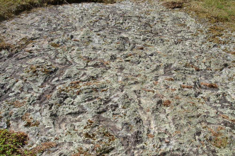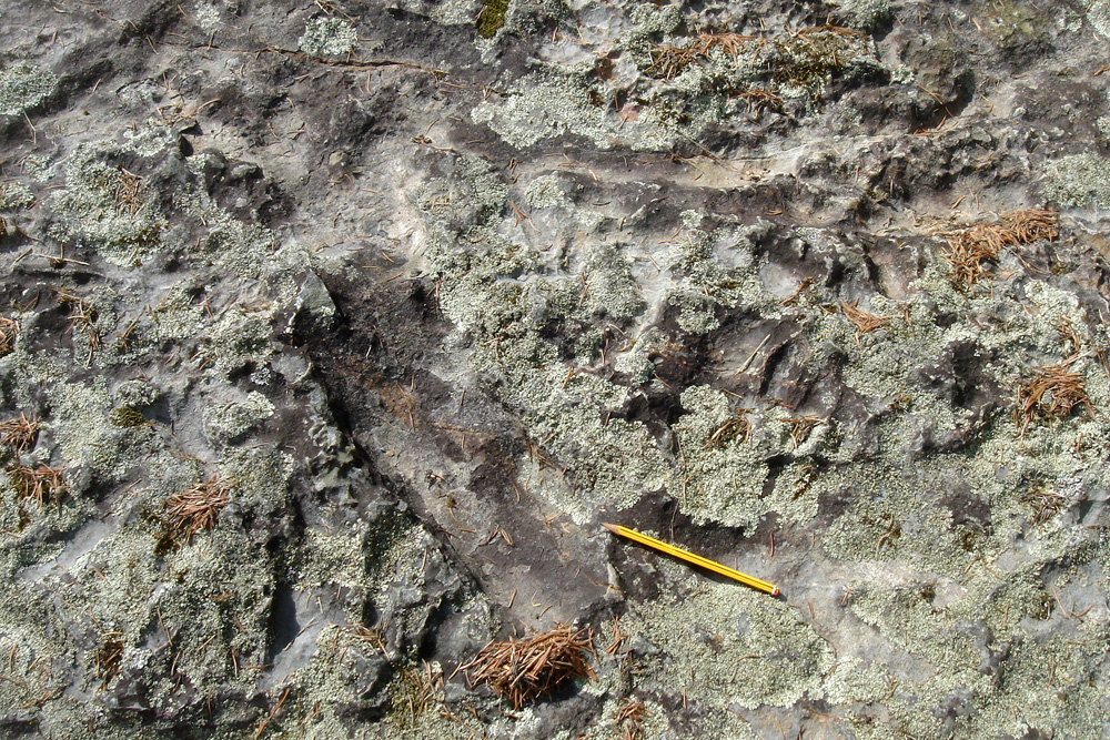 La surface du banc est parcourue par de nombreuses pistes bilobées en creux ; les pistes sinueuses, longues de plusieurs décimètres, sont des traces de locomotion de type Cruziana. |
