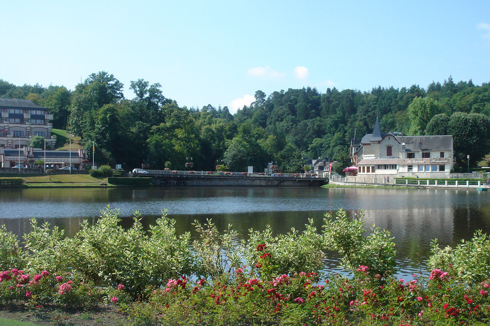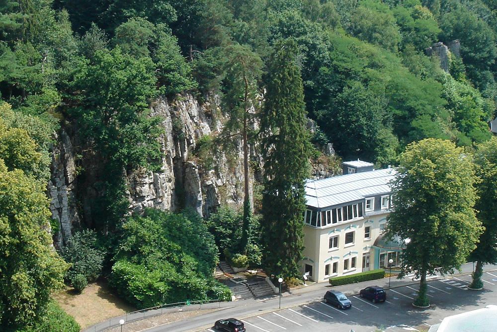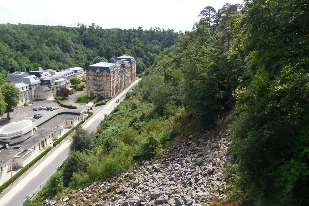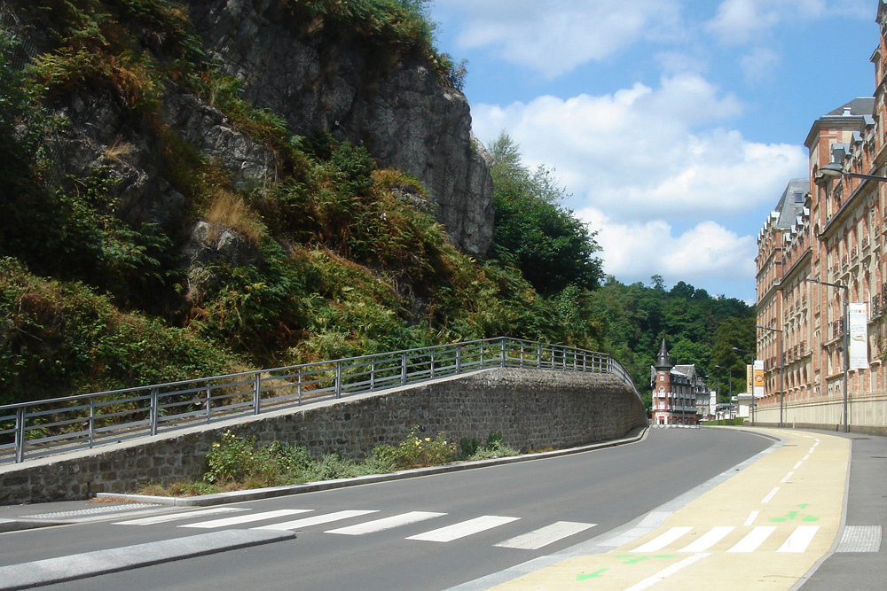Taillée dans le Grès armoricain, la paroi verticale de la rive gauche de la cluse est visible derrière l’établissement thermal. |