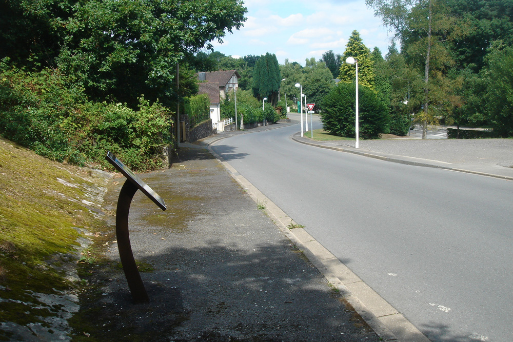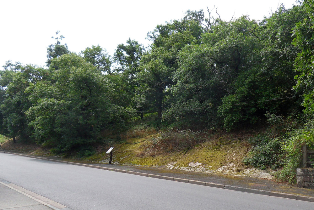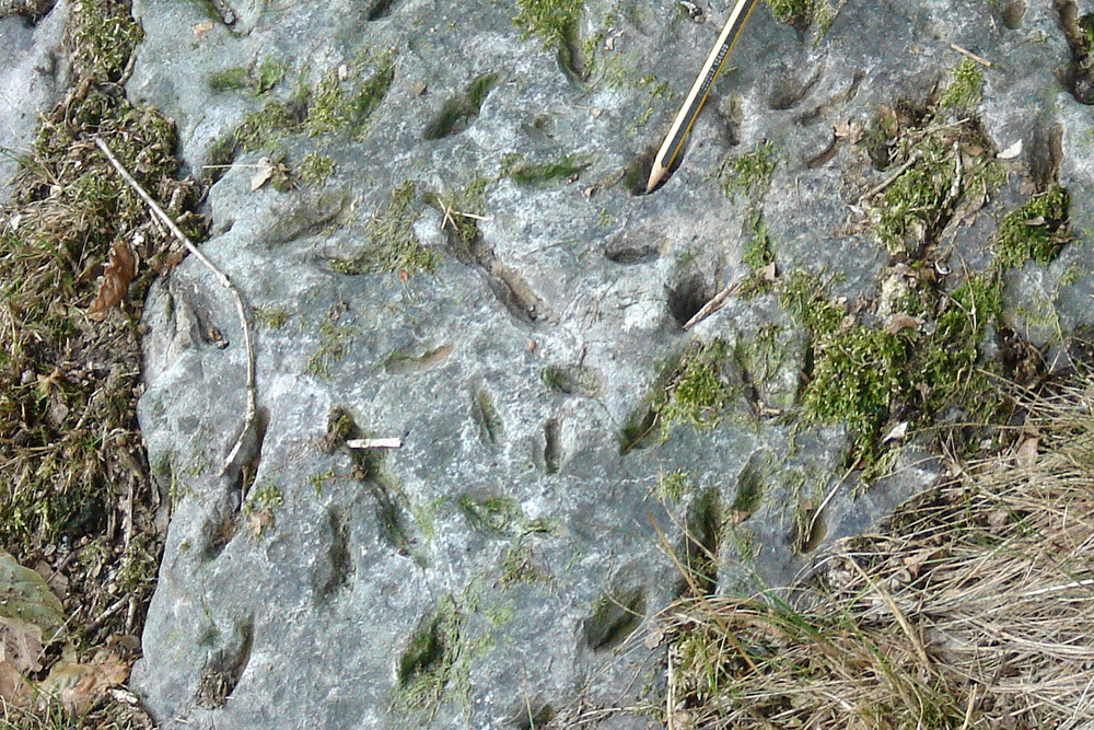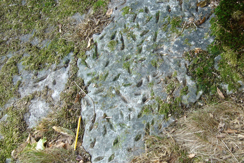 Des traces remarquables, dont une succession de « pas de bœuf », se situent juste à gauche du panneau. Ici, lors de la prise de la photo, en 2013, elles étaient en partie recouvertes de mousses. |