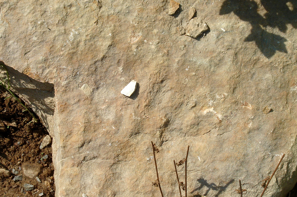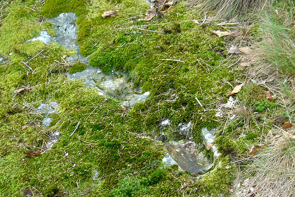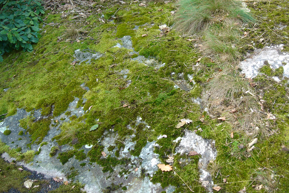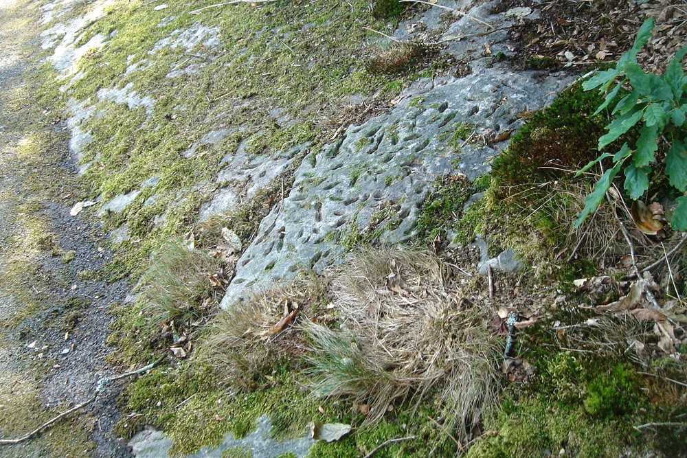 A proximité d’une série de traces de type Rusophycusen partie masquées par les mousses, on peut observer une empreinte circulaire, non identifiée. |