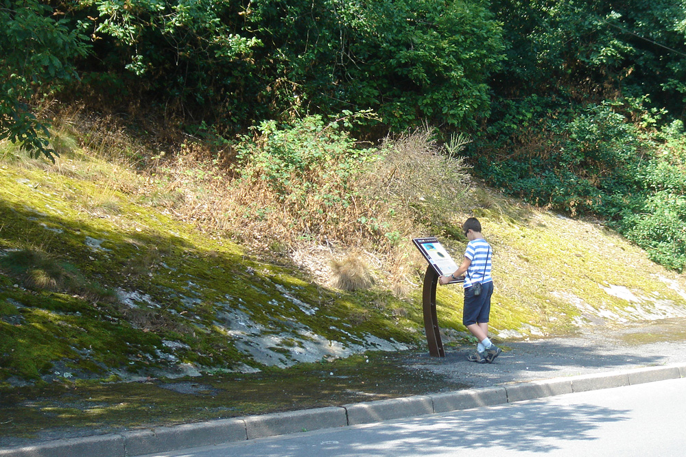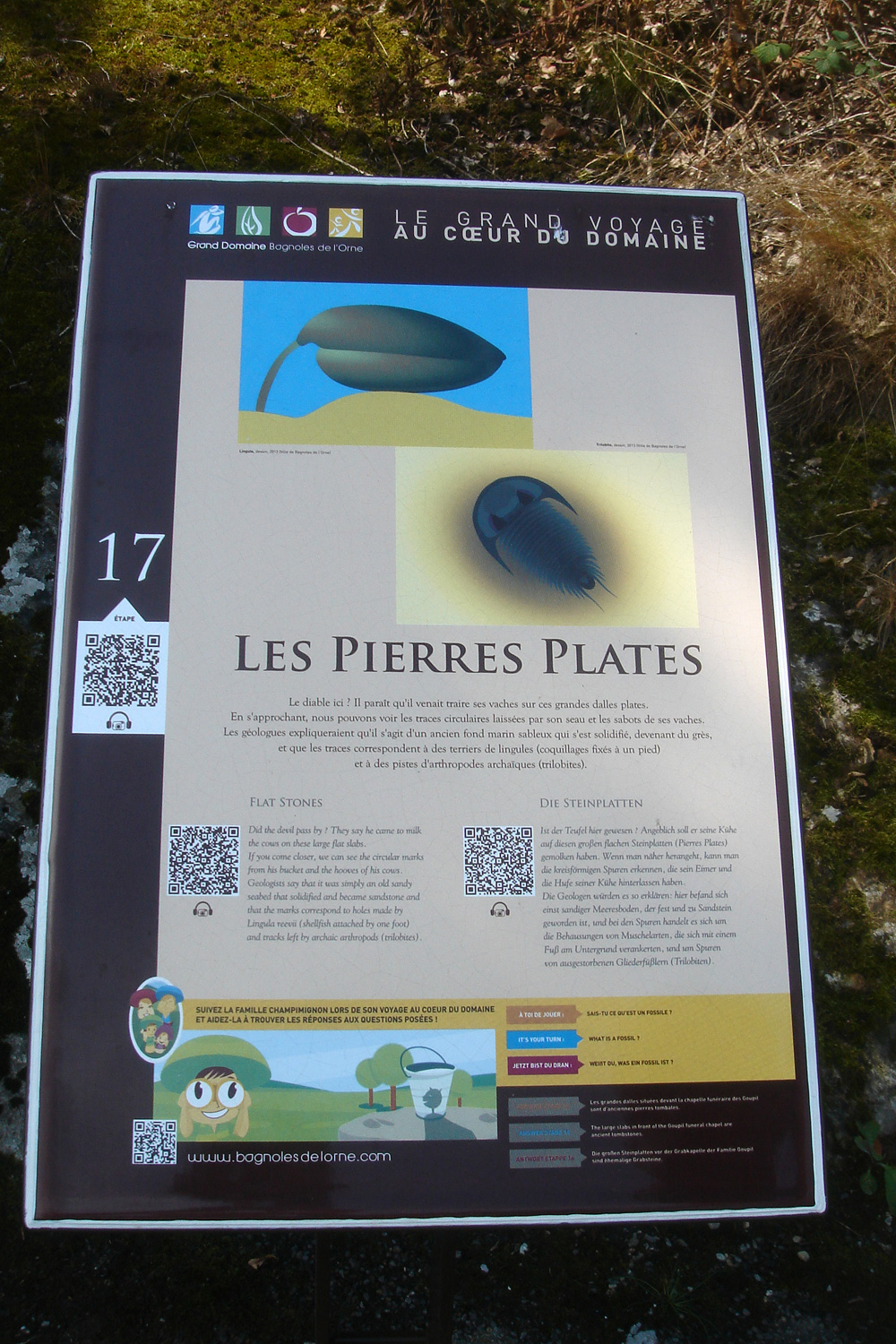 Le panneau d’information évoque la présence de lingules (brachiopodes) et de trilobites (arthropodes) sur le fond marin où s’est déposé le sable qui s’est ensuite transformé en grès. |