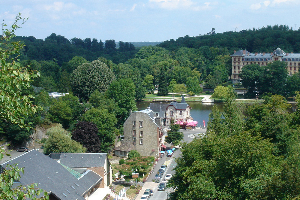 Les Schistes du Pissot occupent la zone basse de la ville où se situent le lac du Casino et l’hippodrome. Ils s’intercalent entre le Grès armoricain dont un affleurement est visible derrière le toit du premier plan à gauche, et le Grès de May qui constitue la crête boisée située derrière le Grand Hôtel dominant le lac. |