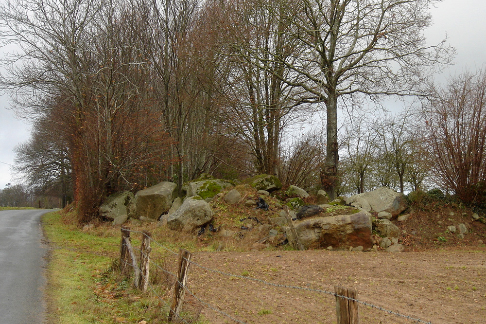 Gros blocs de dolérite accumulés en bordure d’un champ, le long de la route D835 |