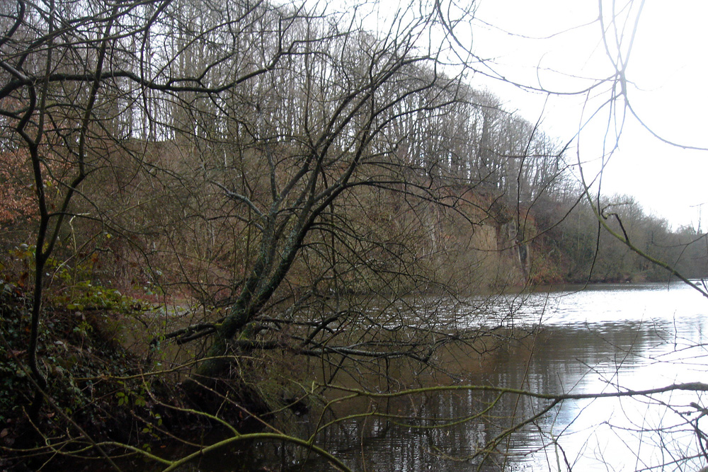 Après exploitation, le filon de dolérite laisse la place à un vaste plan d’eau aux parois granitiques abruptes. |
