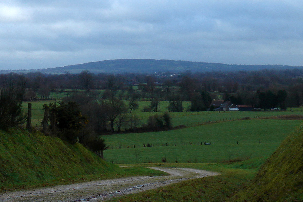 Vue sur le Mont Margantin Constitué par les cornéennes de l’auréole métamorphique de la granodiorite cadomienne, le Mont Margantin forme à l’horizon un relief isolé d’une altitude de 270m. Vue prise depuis la crête constituée par le filon de la Haute Lande, près du hameau de la Bouhardière |