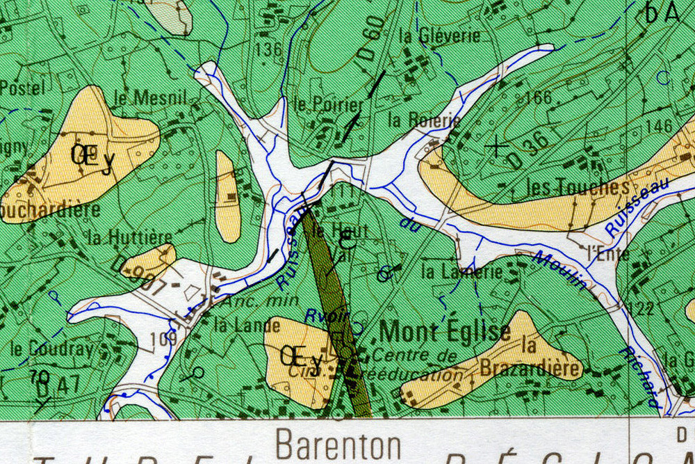 Extrémité nord du filon de Barenton sur la carte géologique au 1/50 000, feuille de Mortain (secteur sud)