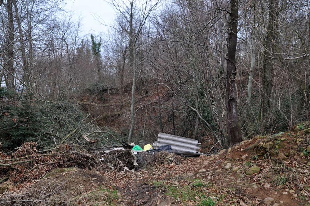 L’excavation laissée par l’exploitation de la dolérite est gagnée par la végétation ; un dépôt sauvage d’ordures envahit le côté proche de la route. Au premier plan, on observe des boules de dolérite provenant du talus routier. |