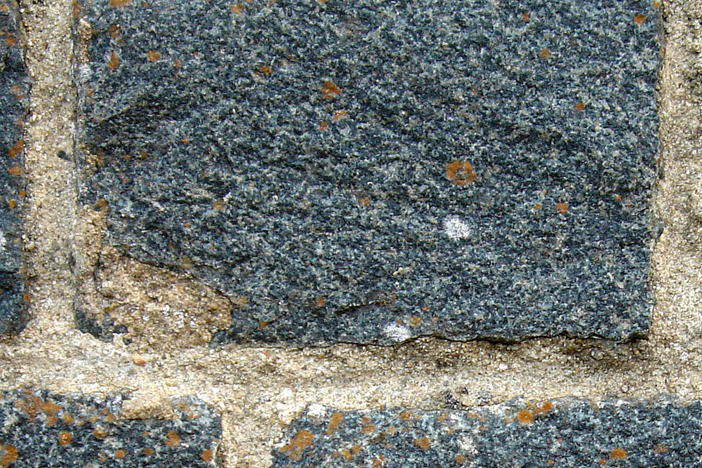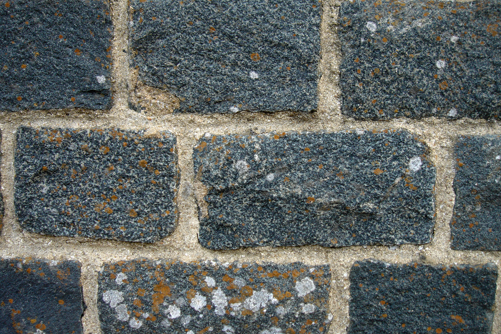 Moellons de dolérite dans le mur d’un bâtiment de la rue Montéglise